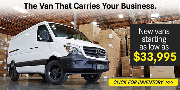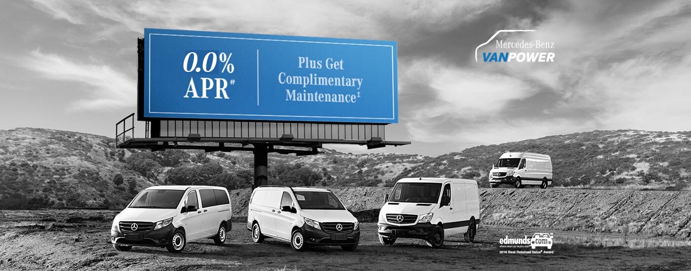 Only valid on 2017 Mercedes-Benz Sprinter and Metris Vans (excluding Sprinter Cab Chassis) Qualified commercial customers only. 2.9% APR financing for 24 months at $42.94 per month, per $1,000 financed and 2.9% APR financing for 36 months at $29.04 per month, per $1,000 financed.. Excludes leases and balloon contracts and National Fleet customers. Available only at participating authorized Mercedes-Benz Vans dealers through Mercedes-Benz Financial Services (MBFS). Must take delivery of vehicle by October 1, 2018. Specific vehicles are subject to availability and may have to be ordered. Subject to credit approval by MBFS. Actual rates, terms, down payment, and program eligibility will be determined by MBFS Credit Team based upon creditworthiness of customer. Program rates or terms may be changed or the program may be terminated at any time at the sole discretion of MBFS. Rate applies only to Mercedes-Benz Commercial van vehicles. To qualify, the total amount financed cannot exceed 110% of MSRP. See your authorized Mercedes-Benz Vans dealer for complete details on this and other finance offers. Offer valid through October 1, 2018.