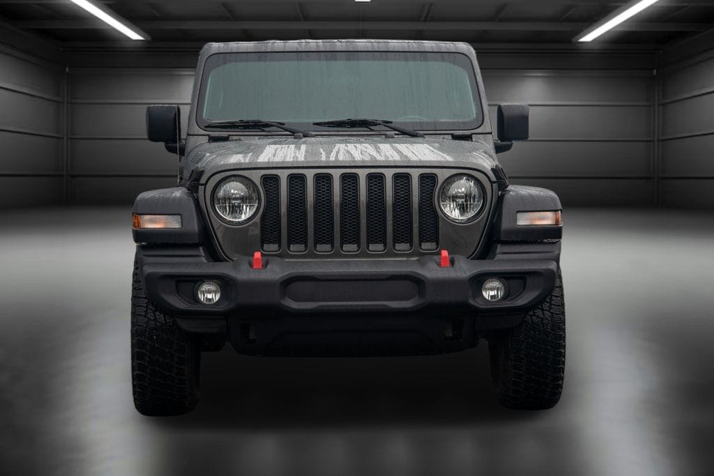 Designed to tackle any terrain, this Wrangler boasts heavy-duty suspension with gas shocks, anti-lock 4-wheel disc brakes, and an anti-spin differential rear axle. The bold exterior features a body-color grille with gloss black accents, a gloss black Jeep badge, and 18-inch gloss black aluminum wheels. The deep-tint sunscreen windows and black 3-piece hard top create a striking, modern look.